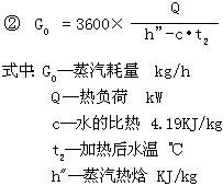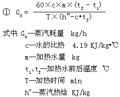 YTW浸沒式汽水加熱器有額定的蒸汽耗量指標,設計時根據實際所需要的蒸汽耗量,選用一臺或多臺加熱器。實際所需蒸汽耗量可參照以下公式(①用于間斷加熱,②用于連續加熱)確定: